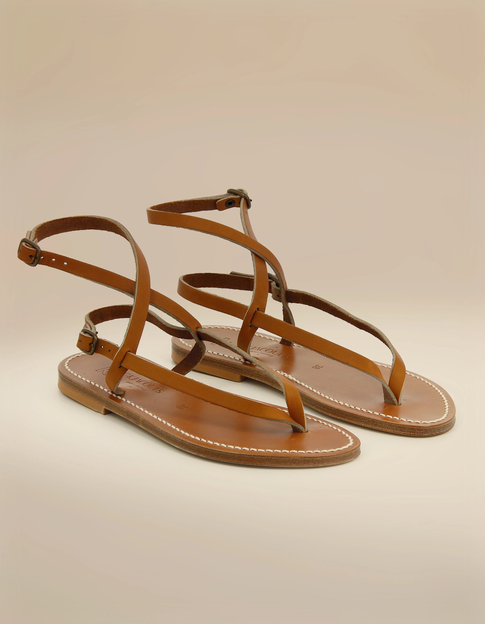 Flat leather sandals with a toe post and criss-cross straps on the instep. Double buckles for adjustment on the foot.