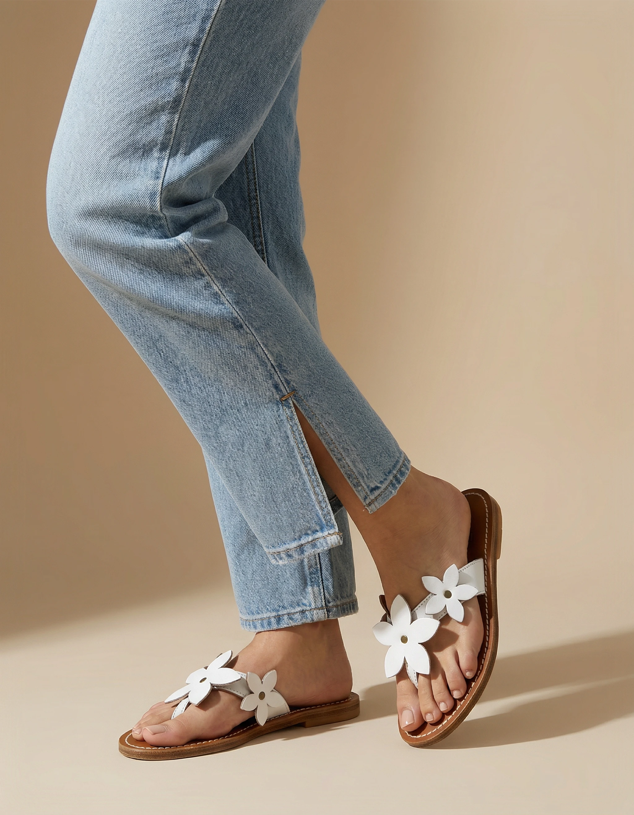Mule-type sandals with toe post, adorned with 3 leather flowers. Leather insoles and outsoles. Natural rubber heel.