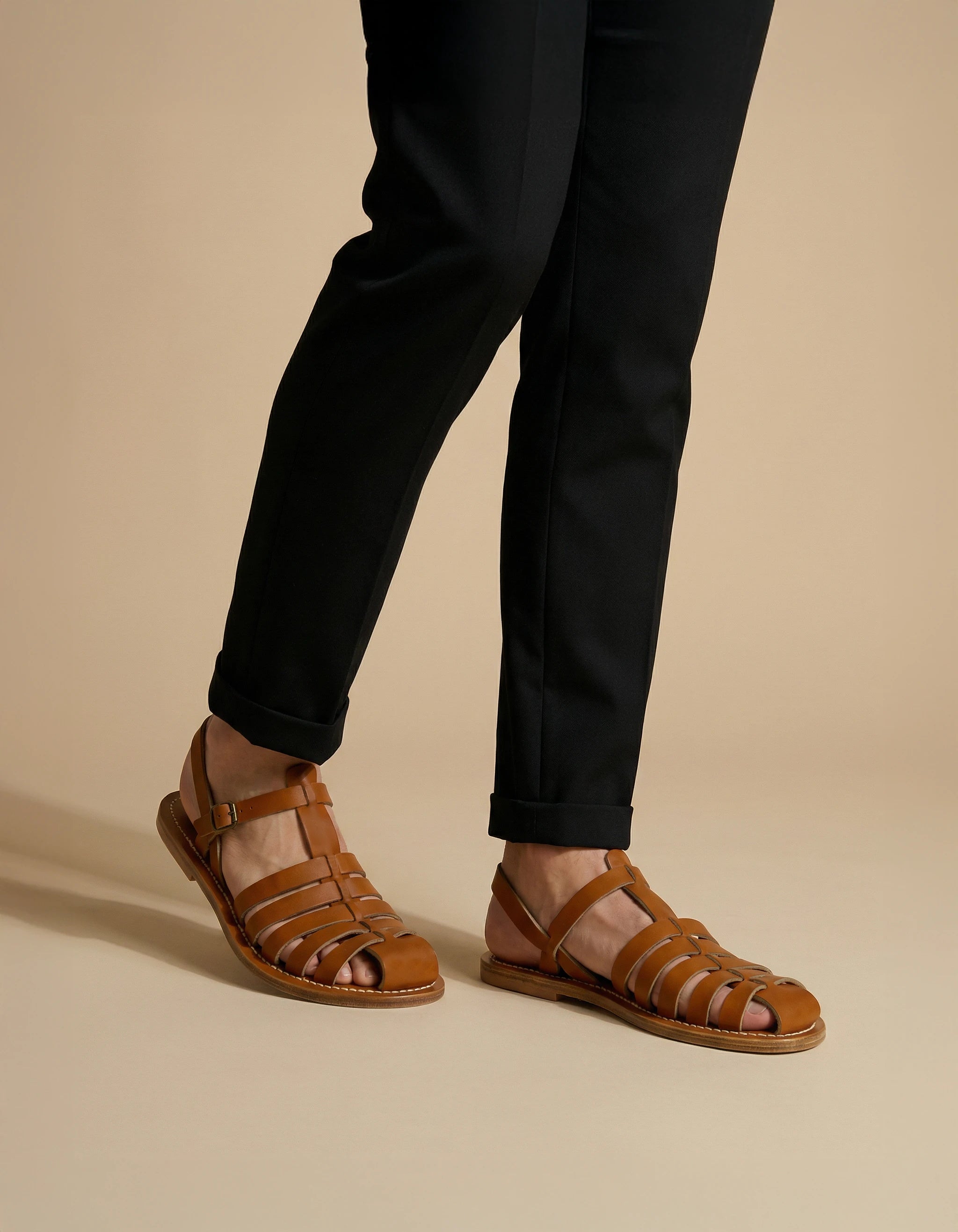 Closed-toe sandals. Leather insole and outsole. Rubber heel tip made of natural hevea rubber.