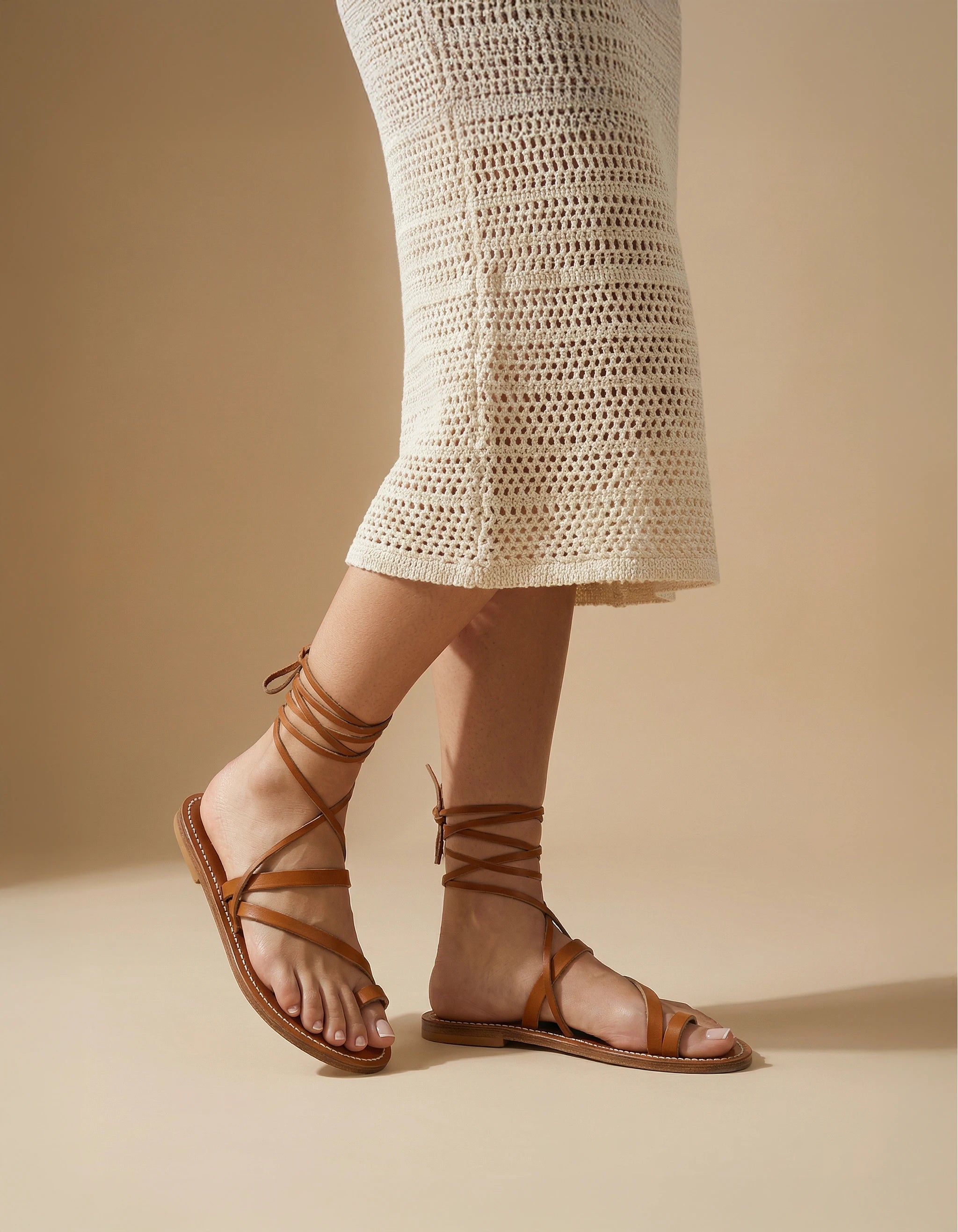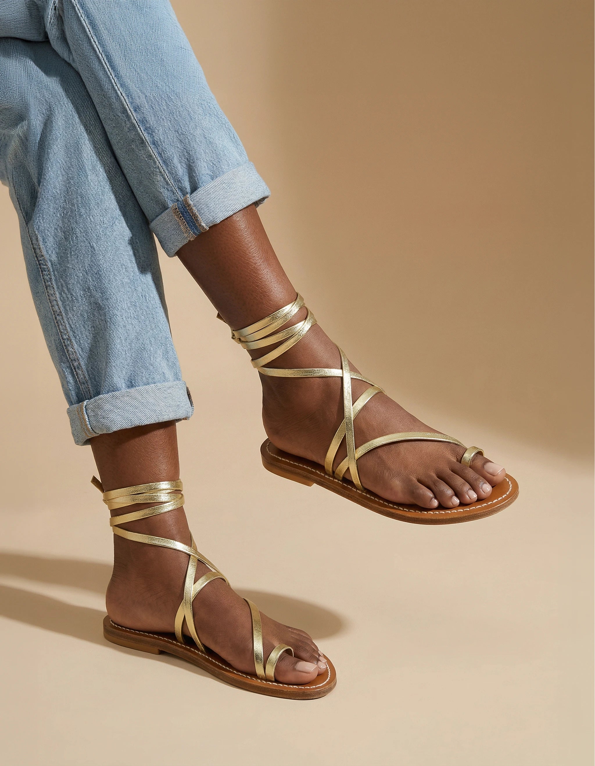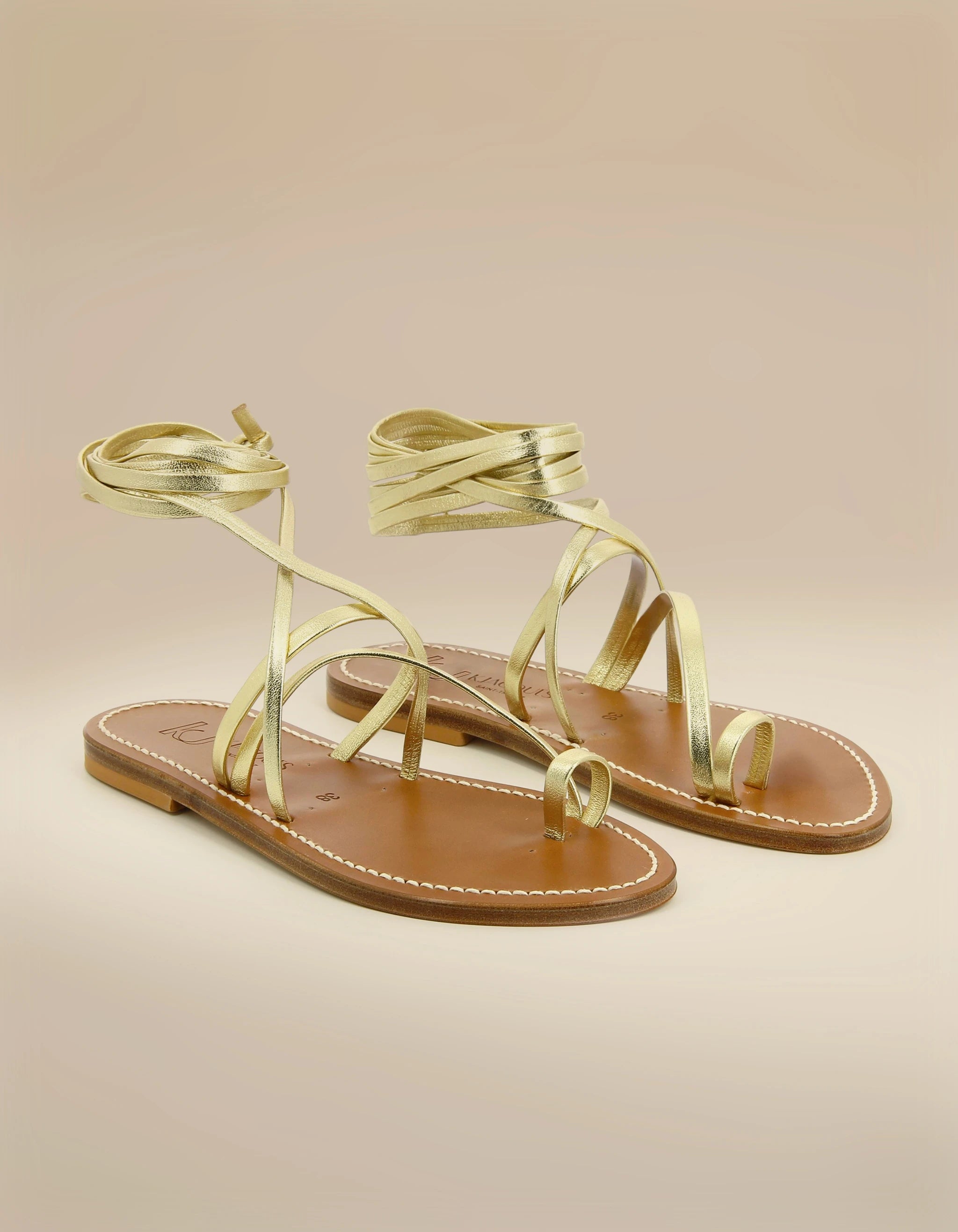 The ELLADA sandals have a feminine and elegant look. These gladiator sandals are made up of a flat sole and a single lace that criss-crosses and ties around the ankle or calf. It is an ideal model for a Hippie Chic look. K.Jacques Tropezian sandals are handcrafted in Saint-Tropez, France. Our sandals have a leather sole and a natural rubber heel.