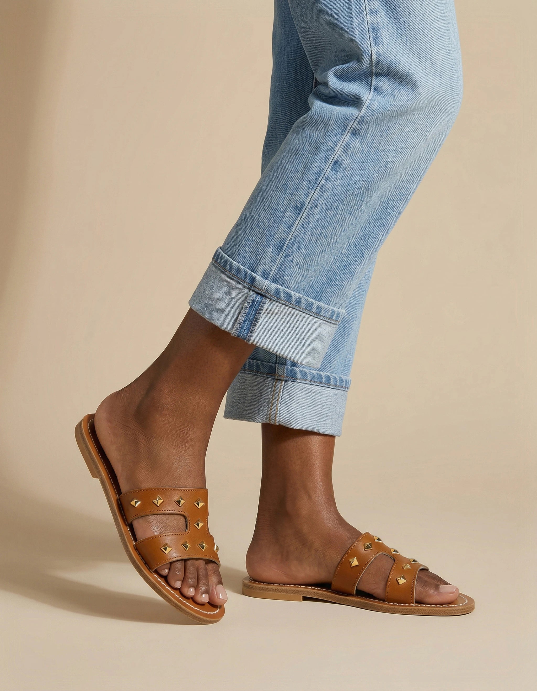 Son esthétique minimaliste repose sur une large bride centrale ajourée avec des clous en forme de Pyramide, qui structure élégamment le pied tout en assurant un excellent maintien. Sa silhouette épurée et son confort en font un choix idéal pour une allure chic et décontractée, aussi bien en ville qu’en bord de mer.