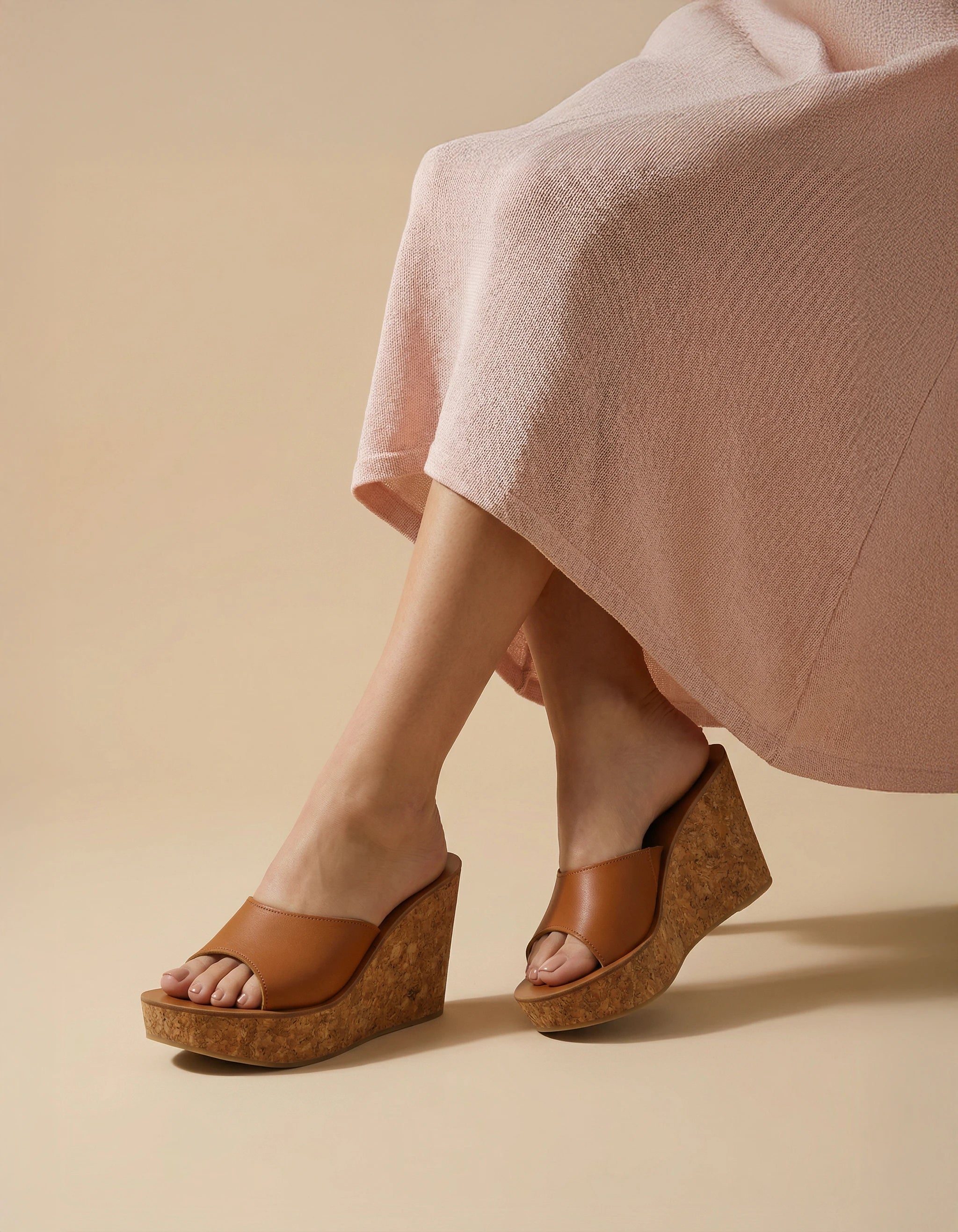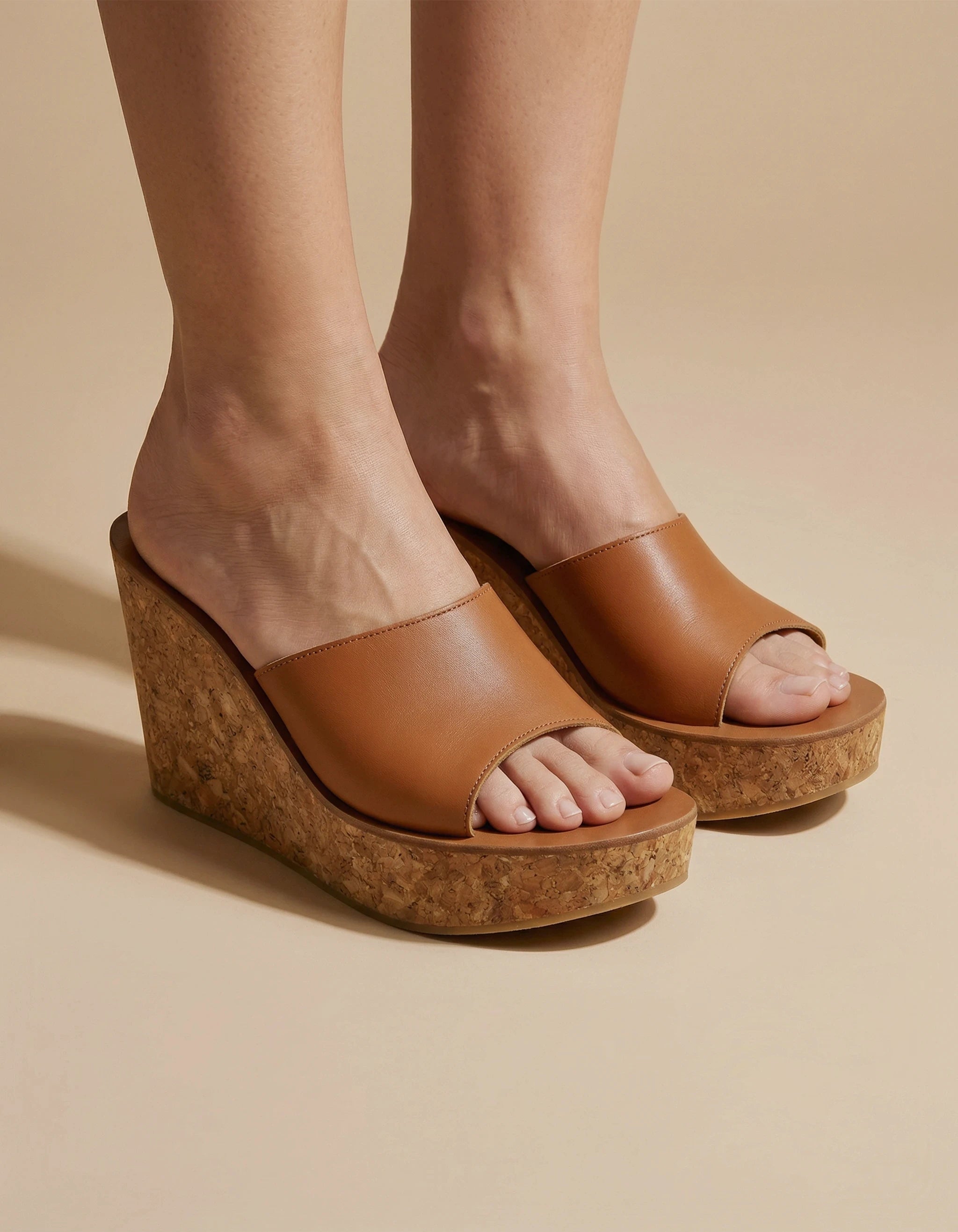 Talon compensées en liège sculpté dans la masse. Hauteur de 10 cm à l'arrière et 3 cm à l'avant. Semelles premières en cuir et semelles d'usures en crêpe de caoutchouc naturel.